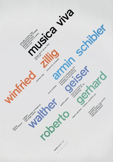 Musica Viva posters by Muller Brockman, again with no set grid, but this time making use of a number of colours which run across the series. These are supposed to portray the rhythm in the music through simple typographic and geometric layouts, and I think they achieve this. Really like the use of both right and left aligned type as it provides some really interesting juxta-positions of information that would not be achieved with only left aligned. Maybe something to consider in my identity.